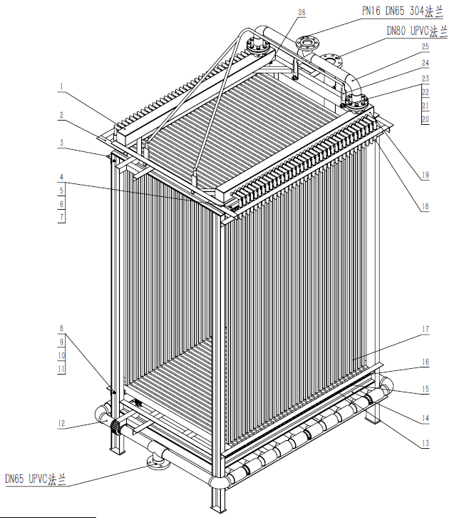| 膜組件尺寸(mm) | 1250×30×2400 | 1250×30×2000 | 1250×30×1500 |