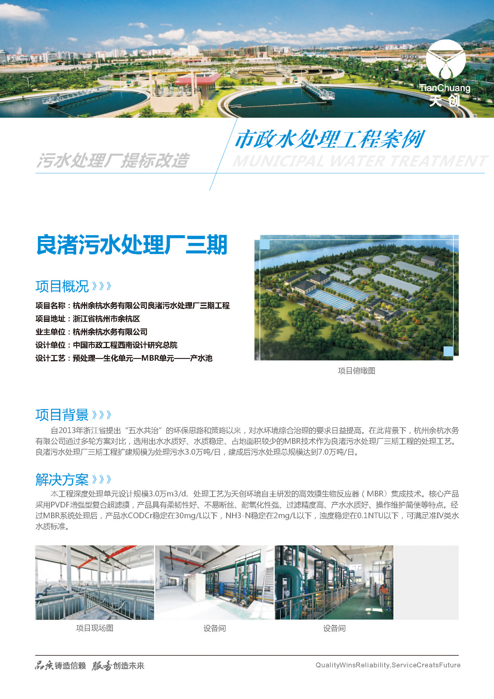 自2013年浙江省提出“五水共治“的環(huán)保思路和策路以來,對水環(huán)境綜合治理的要求日益提高。在此背景下,杭州余杭水務有限公司通過多輪方案對比,選用出水水質(zhì)好、水質(zhì)穩(wěn)定、占地面積較少的MBR技術作為良渚污水處理廠三期工程的處理工藝良者污水處理廠三期工程擴建規(guī)模為處理污水3.0萬噸/日,建成后污水處理總規(guī)模達到7.0萬噸/日