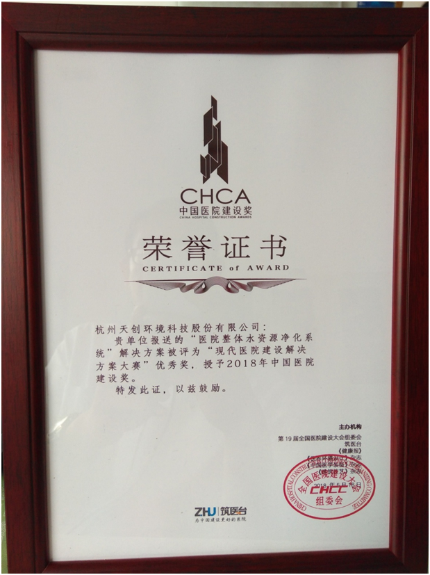 同期舉行的2018年中國(guó)醫(yī)院建設(shè)獎(jiǎng),素有醫(yī)院建設(shè)風(fēng)向標(biāo)之稱。作為行業(yè)權(quán)威評(píng)選系列評(píng)選活動(dòng),自啟動(dòng)以來(lái),獲得了行業(yè)及社會(huì)的高度關(guān)注和熱情參與!經(jīng)過(guò)微信公眾號(hào)投票,以及專業(yè)評(píng)委打分等環(huán)節(jié)層層選拔,杭州天創(chuàng)環(huán)境科技股份有限公司在憑借“醫(yī)院整體水資源凈化系統(tǒng)”解決方案獲得了由大會(huì)組委會(huì)授予的“現(xiàn)代醫(yī)院建設(shè)解決方案大賽”優(yōu)秀獎(jiǎng)。