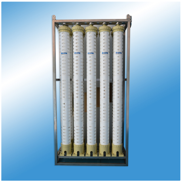 浸沒式膜過濾系統(tǒng)采用開放式外壓超濾膜組件,將其完全浸沒于膜池之中,通過液位壓差結(jié)合抽吸泵負(fù)壓抽吸產(chǎn)水,以膜組件取代傳統(tǒng)混凝、沉淀、過濾等工藝過程,廣泛應(yīng)用于飲用水安全、污水處理廠提標(biāo)、河道冶理、再生水資源、工水廢水回用、海水淡化等領(lǐng)域。